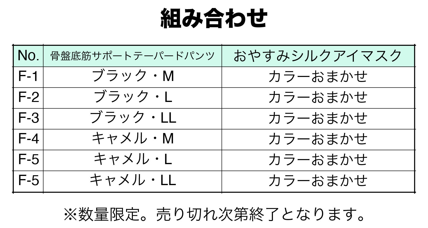 カラー・サイズの組み合わせは5パターンになります。